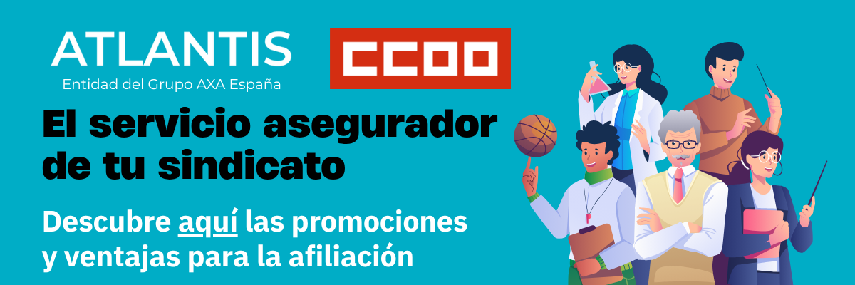 Ventajas para la afiliación de CCOO: 7% de descuento en tu seguro del coche; 10% de descuento en el precio del seguro de responsabilidad civil de perros; 10% de descuento en el precio del seguro de mascota sana; 10% de descuento en el precio del seguro de asistencia en viaje. Ventajas válidas hasta el 31/12/2025.