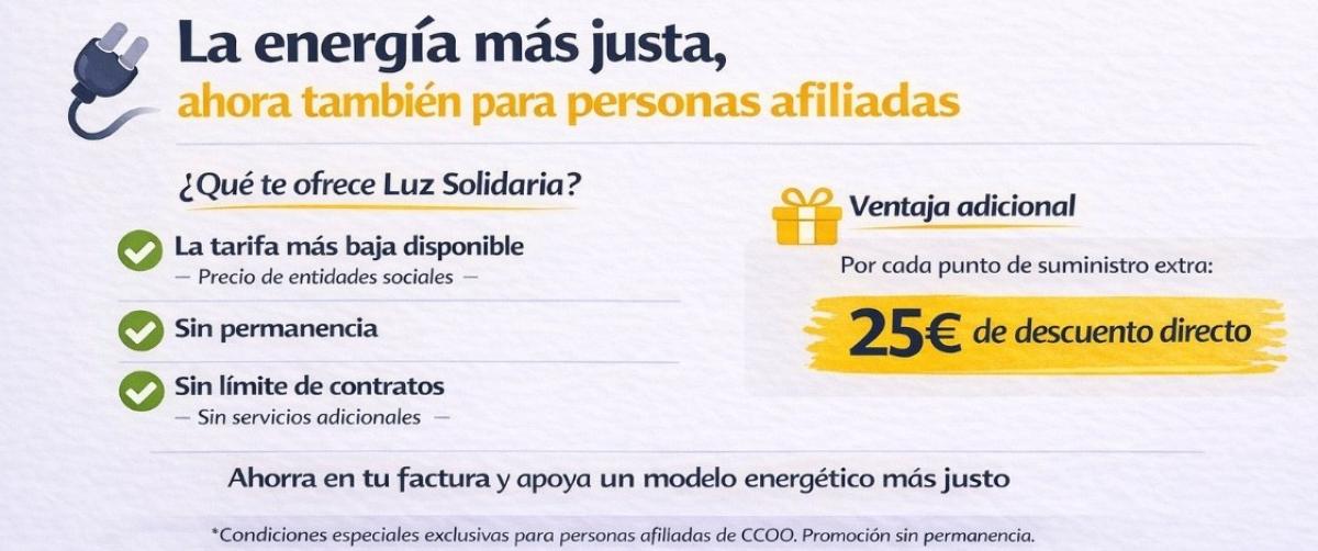 Ventaja Especial de lanzamiento: Estudio gratuito y asesoramiento sobre cómo ahorrar en tu factura de la luz. Luz Solidaria te podrá ofertar, si lo deseas, la tarifa más baja de todas las posibles con las que trabajan (equivalente al precio que ofrecen a entidades sociales), sin límite de contratos por persona afiliada y sin permanencia ni obligación de firmar ningún tipo de servicio adicional.