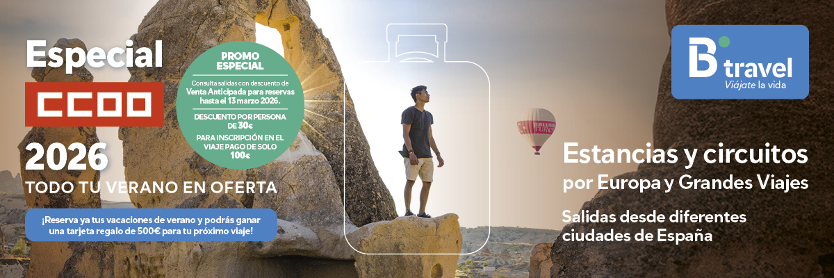 Circuitos Verano 2026. Precios exclusivos para personas afiliadas a CCOO. ¡Reserva ya tus vacaciones de verano y podrás ganar una tarjeta regalo de 500 € para tu próximo viaje! Consulta este folleto, reserva hasta el 13 de marzo en las 3 oficinas indicadas a continuación para que se te apliquen las promociones que te presentamos en el documento disponible en 'Documentos asociados'.