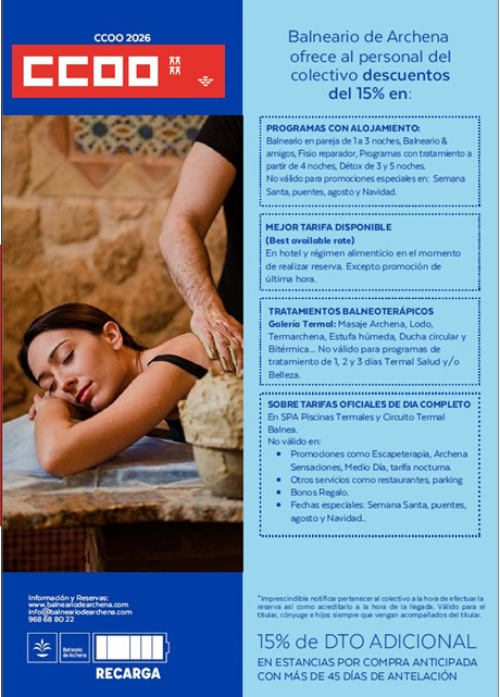 15% de descuento para las personas afiliadas a CCOO. Oferta Tiempo Libre - Verano 2026: Ver documento con precios y turnos en Media Pensión. Para información y reservas contacta a través del correo reservas@hosteriadelhuerna.es ó telefonicamente en el 689547525. Una vez recibida tu solicitud, contactarán contigo para confirmar la disponibilidad.