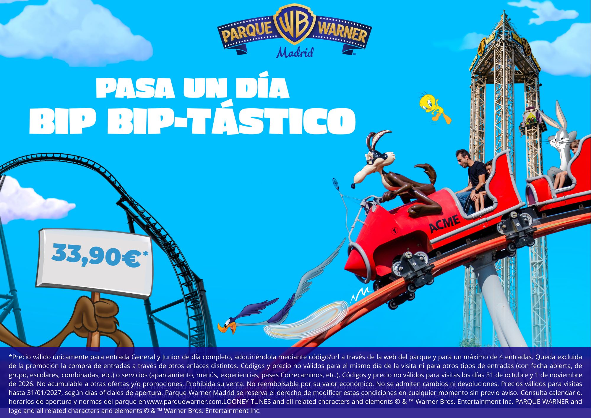 - No aplican para visitas los días 31 de octubre y 1 de noviembre de 2026 en Parque Warner Madrid y Parque de Atracciones de Madrid.