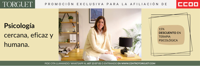 Oferta especial para la afiliación de CCOO y familiares directos. Descuento del 15% en sesiones de terapia (precio afiliación 51€ en lugar de 60€). Descuento del 15% en tests y diagnosticos (precio afiliación 340€ en lugar de 400€). ¡Cuidamos tu salud mental y bienestar emocional! Condiciones no acumulables, válidas hasta el 30/04/2026. Más información en 'Documentos asociados'