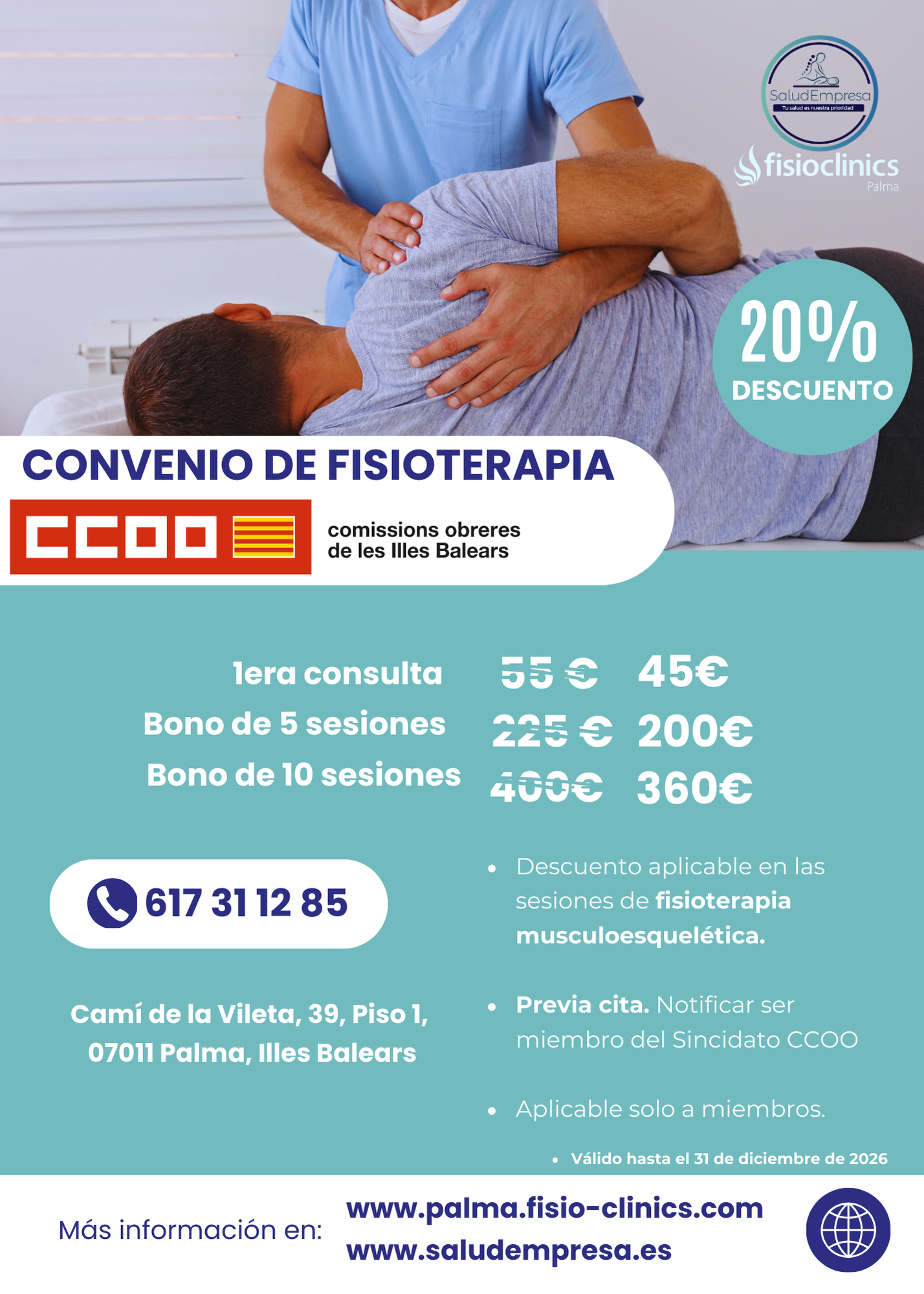 - Sesión individual de fisioterapia: Precio sin descuento 55€, para afiliados/as de CCOO 45€.